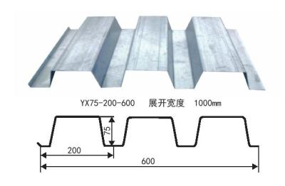 YX75-200-600 YL75-200-600 楼承板(钢承板,建筑压型钢板)是采用镀锌钢板经辊压冷弯成型,其截面成V型、U型、梯形或类似这几种形状的波形,主要用作永久性模板,也可被选为其他用途。