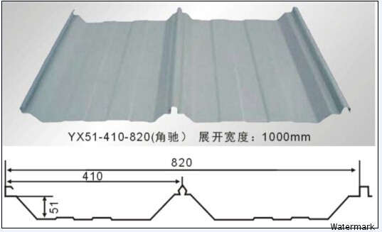 角驰III型屋面板,主要特征表现在热胀冷缩,滑动性好,板与板之间防水性能好,最早都是760板宽的,能充分满足北方大部分地区的荷载情况,现在在南方由于屋面荷载比北方小(主要是雪荷载),为了节省材料,板宽改成了820型的。角驰Ⅲ51-410-820型 该系列压型板解决了常规系列压型板的屋面渗漏问题,压型板的连接打破了传统屋面用螺栓连接的惯例,安装方法采用360°锁口咬合安装,使屋面防水效果更加完好。 该压型板属咬口屋面板,具有波峰高、强度大、无螺钉